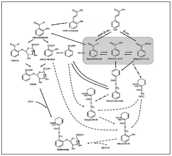 Phenolic glycosides can be generated by cinnamic acid in three methods. Cinnamic acid is catalyzed to produce o-coumaric acid to reform salicylaldehyde into salicyl alcohol and helicon in the first method. Thus, 1-hydroxy-6-oxo-2-cyclohexene-1-carboxylic acid and salicin react to form salicortin. In the second method, and according to Figure 2, cinnamic acid forms benzoyl-CoA through the β-oxidative (β-oxo) pathway. Further, benzoyl-CoA conjugates benzyl alcohol to hydrolyze benzyl benzoate creating mostly benzoic acid in the β-oxo pathway. In the third method, the benzoate pool may degenerate using two separate non-β-oxo pathways by turning cinnamic acid or phenylpyruvate directly into benzaldehyde. Both salicyl and hydroxy cyclohexenonoyl moieties may be descended from benzoate, resulting in benzoate pool regenerations as a regulator of salicortin biosynthesis (Figure 2) [48].