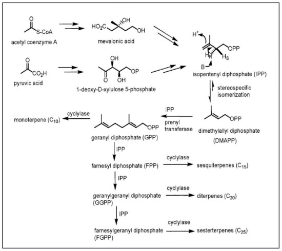 The terpenoid pathway produces numerous secondary metabolites and is a crucial biochemical pathway in plants [85]. It affects the production of photosynthetic pigments, including chlorophyll and carotenoids, and plant hormones such as abscisic acid, gibberellins, brassinolides, and cytokinins [85]. There are two principal pathways in plants involved in terpene production: cytosol-localized mevalonate and plastid-localized methylerythritol phosphate (also called 1-deoxy-d-xylulose) [51]. Both pathways begin with the production of the C5 precursor isopentenyl pyrophosphate (IPP). First, IPP turns into the allylic isomer, termed dimethylallyl pyrophosphate (DMAPP). Next, IPP and DMAPP (the most specific and abundant product of the plant terpene family) regulate the development of geranyl pyrophosphate (GPP) and geranylgeranyl pyrophosphate (GGPP) via farnesyl pyrophosphate (FPP) and plastids in the cytosol (Figure 3). In this process, terpene synthases catalyze monoterpenes, diterpenes, and sesquiterpenes from GPP, GGPP, and FPP (Figure 3). All sesquiterpenes are constructed from FPP by the development of sesquiterpene synthase. Importantly, terpene synthase can provide multiple products from a single substrate [85].