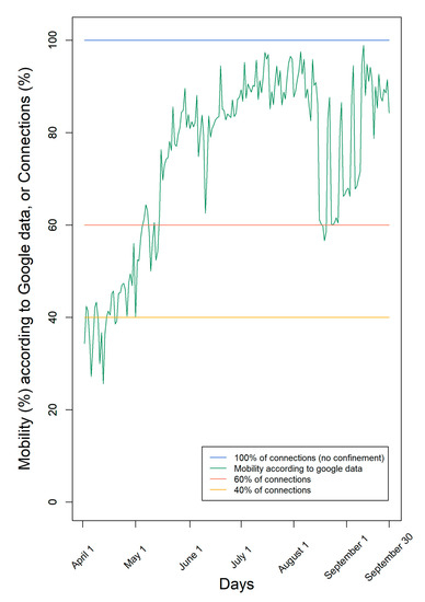 In the simulations, we considered three mobility scenarios: (i) using the real mobility data from Google from the period between 1 April and 30 September; (ii) with fixed mobility of 60%; and (iii) with fixed mobility of 40%.