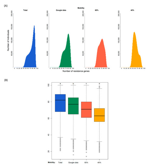 Diversity of resistance genes in four different scenarios of confinement after 180 days. Simulation (i) without confinement (100% of connections); (ii) using the real mobility data from Google assuming that a certain reduction of mobility corresponds to a similar reduction of connections; and with a fixed proportion of connections of (iii) 60% and (iv) 40%. (A): Distribution of the predicted number of antibiotic resistance gene types among individuals at the end of the simulation. (B): Each box plot represents the distribution of values: the bottom and top of the box are the first and third quartiles, the horizontal line is the median, the vertical lines are the 1.5 interquartile range. Black circles represent outliers. After a Kruskal–Wallis analysis (see main text), post hoc comparisons using the Dunn test indicated that the effect of confinement is significantly different in the four confinement types as indicated by the four different letters a, b, c, and d (p-value < 0.000).