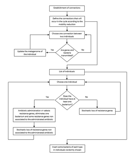 We inserted some different bacterial pathogenic species into random individuals per cycle to simulate the migration of bacteria from individuals outside the network or the contamination from sources such as food or contaminated water. In this model, the only difference that we consider between species is the antibiotic to which they are susceptible, as explained below.