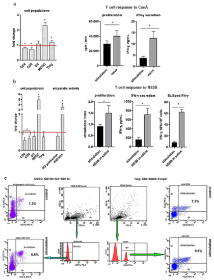 An increase in the populations of suppressor cells in the spleen of mice causes a decrease of the cellular immune response. To increase the level of suppressive cells in spleens, the mice (n = 3) were injected with CpG ODN 1826 + IFA SC, and after 10 days, the T cell response of lymphocytes to ConA was evaluated (a). The mice (n = 3) were IP injected with an IFA (0.5 mL/mouse, six times weekly) accompanied by triple SC immunization with the NS5B protein (4 µg/mouse), and after 9 days, we evaluated the T cell response of lymphocytes to NS5B (b). The values of cell populations and enzymatic activity obtained were normalized to the values obtained for the control mice (red lines); * p < 0.05 compared to the group of naïve mice (a) and the group of mice immunized with NS5B in saline (b). (c) Gating strategies and representative dot plots for MDSCs (left) and Tregs (right). The splenocytes were stained with anti-CD4, anti-CD8, anti-CD11c, anti-CD11b, anti-Gr1, anti-CD25, and anti-Foxp3 antibodies and analyzed by flow cytometry. To determine MDSCs, a population of lymphocytes was isolated (gate P1), and cells from this gate were used to identify CD11c(−) cells. The CD11c(−) dot plot was used to determine the proportion of Gr-1+, CD11b+ cells. To determine Tregs, in the lymphocyte gate (P1), a population of CD4+ T cells was isolated. The CD4+ dot plot was used to determine the proportion of CD25+, FoxP3+ T cells.