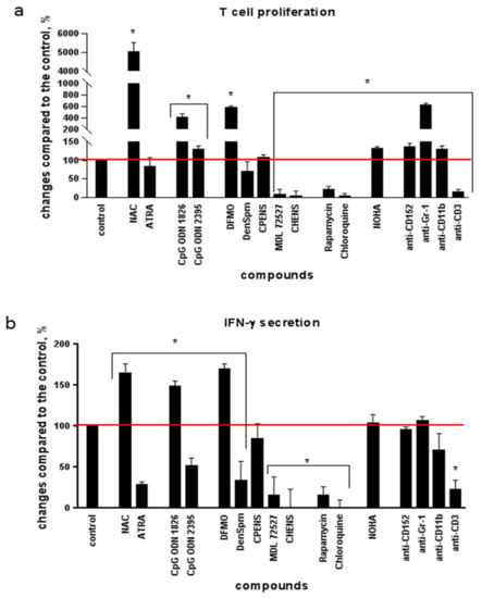 Next, the splenocytes obtained from the mice with a notable increase in the MDSC population and suppressed T cell response were treated ex vivo with the compounds that could affect T cell functions. The latter were evaluated using two parameters, namely lymphocyte proliferation and secretion of IFN-γ in response to ConA. As the positive control, the untreated samples were used, whereas similar cells treated with the antibodies to murine CD3 receptors were used as the negative control. These antibodies almost completely blocked the activity of T cells in response to ConA through binding to their receptors (Figure 2a,b). Evaluation of 16 compounds (Table 1, Figure 2) revealed that downregulation of the activity of arginase, an enzyme that is produced by MDSCs, with its specific inhibitor NOHA led to a 30% increase in T cell proliferation (Figure 2a). A similar effect was observed in case of blocking of Treg functions with antibodies to CD152. A more pronounced stimulation of lymphocyte proliferation was detected for antibodies to granulocyte Gr-1 receptor and for three low-molecular-weight compounds: antioxidant N-acetylcysteine (NAC), TLR9 ligand CpG ODN 1826, and polyamine biosynthesis inhibitor DFMO. However, other compounds studied either suppressed the T cell response or did not affect it. Hence, this experiment allowed identifying three compounds that had the highest stimulatory effect on in vitro proliferation and IFN-γ secretion: NAC, DFMO, and CpG ODN 1826. Noteworthily, the repeated experiments with different concentrations of these three compounds showed that their effect on the immune response in vitro was dose-dependent. For NAC, the effective concentrations were 5–10 mM, for DFMO—10 mM, for CpG ODN 1826—1.5–3.5 µM.