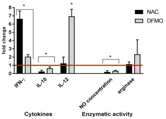 Changes in cytokine secretion and enzymatic activity of the splenocytes treated with NAC and DFMO. Lymphocytes of the intact mice were incubated with the compounds for 3 days at 37 °C in a humid atmosphere containing 5% CO2. Cytokines were quantified by ELISA in conditioned media, and enzymatic activity was measured in cell lysates. The values obtained were normalized to the values obtained for the samples without compounds (red line). The values in each diagram are the means ± SD of four measurements done in three independent experiments; * p < 0.05 compared to the control (samples with media alone).