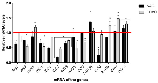 Next, analysis of transcription of 14 genes involved in the regulation of immune response was performed. For 13 of them, statistically significant changes were found (Figure 6). Noteworthily, the compounds significantly downregulated transcription genes of arginase 2, IRG, IDO2, and iNOS compared to the control group. In addition, NAC reduced the mRNA levels of arginase 1, IDO1, and DFMO—an eNOS and ODC, but upregulated ICAM-1. For cytokine genes, an increase in the expression of type I interferon, IFN-α, was found, whereas IFN-γ and IL-12 were upregulated only during incubation with DFMO, and IL10 was downregulated by NAC.