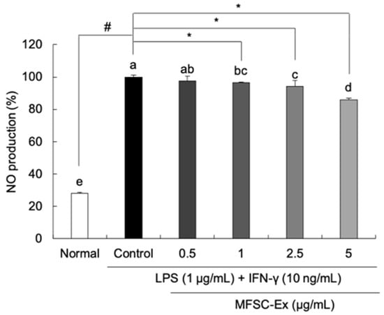 2.2. Inhibitory Effect of MFSC-Ex on NO Generation in LPS/IFN-γ-Stimulated RAW 264.7 Macrophage Cells