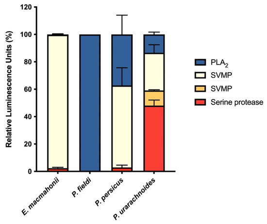 The venoms varied substantially in their activity on fluorogenic substrates (Figure 1) in corroboration with their proteomic profile [11,18]. The extent of phospholipase and metalloprotease activities is also broadly aligned with the venom content described in prior proteomic studies [11,18]. Assessment of protease activity revealed that serine proteases were the most abundant protease component in P. urarachnoides venom while contributing little to the overall protease activity in the other three venoms assayed. This agreed with the proteomic analysis for the P. urarachnoides venom, which indicates that serine proteases are featured to a greater extent than in its congeners’ venoms [11]. However, it was incongruent with the extensive expression of serine proteases earlier documented in E. macmahonii venom [18]. Further discrepancies between E. macmahonii venom proteome and protease activity were evident in its apparent lack of PLA2 activity, despite this toxin class having previously been identified in E. macmahonii venom [18]. However, vipers commonly express both enzymatic and non-enzymatic isoforms of PLA2s. This incongruence observed between assay activity and PLA2 abundance may therefore indicate that E. macmahonii venom expresses predominantly non-enzymatic PLA2 isoforms.
