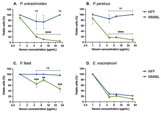 Viable human cells (%) after incubation with Pseudocerastes (A–C) and Eristicophis (D) venoms (1, 5, 10, or 50 µg/mL) for 48 h, quantified by MTT assays. Cell viability readings were normalised against vehicle-treated control cells (data not shown). Venom-treated cell data were tested for normality using Shapiro–Wilk tests, then compared to their controls using unpaired t-tests as they were normally distributed. The data are expressed as mean ± SD and are the result of at least three replicates. **** = p < 0.0001, *** = p < 0.001, ** = p < 0.01, ns = no significant difference between venom-treated (data shown) vs. vehicle-treated control (data not shown) cells. MM96L = melanoma cells, NFF = neonatal foreskin fibroblasts.
