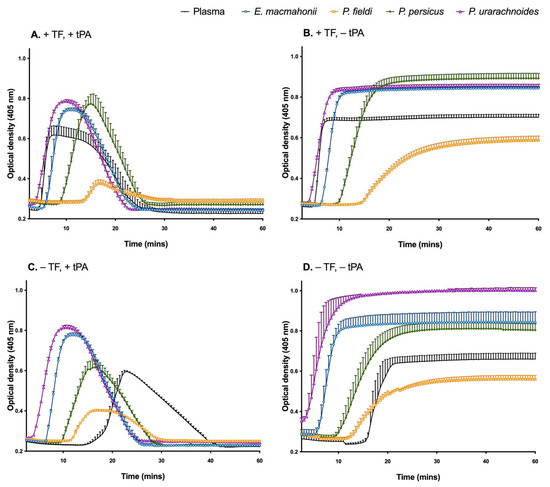 The venoms assayed in the current study have been previously shown to exert different haemotoxic activities in human plasma, such as clot inhibition by P. fieldi and P. persicus and clot stimulation by P. urarachnoides and E. macmahonii [11]. Each venom’s effect on clot dynamics was assessed to investigate this further. Fibrinolytic toxin activity (the lysis of fibrin clots as opposed to that of fibrinogen molecules) has been described for the venom of numerous vipers [24,25] and thus was tested by incubating venoms and human plasma with and without human tissue factor, which initiates clot formation, and human tissue plasminogen activator, which initiates clot lysis.