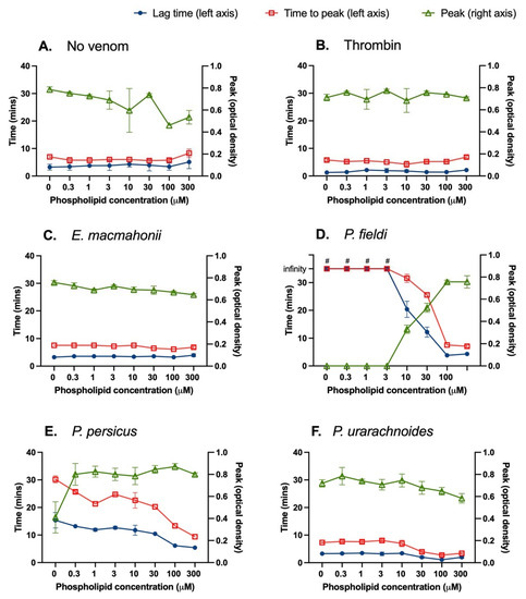 Interactions between venom and anionic phospholipid vesicles on fibrin clot formation were conducted as per fibrinolysis assays, but without the addition of tissue plasminogen activator to venom wells and with an extended concentration range of PCPS across wells (serial dilution: 0, 1, 3, 10, 30, 100 and 300 μM). Reactions in which venom was replaced by thrombin (0.01 μg/μL) were used as a positive control. The lag time was defined as the time point at which the optical density at 405 nm increased (delta absorbance >0.04); the peak time was the time at maximum optical density.