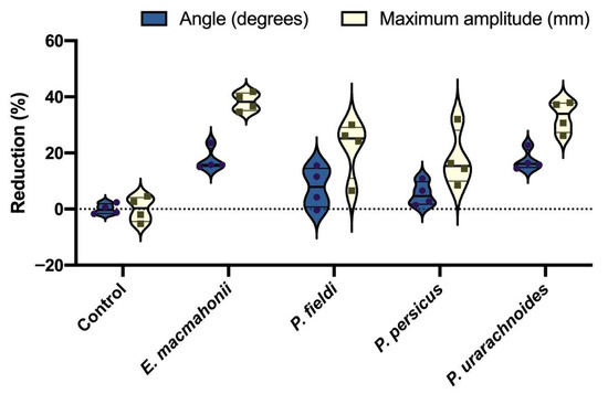 Reduction (%) of functional human fibrinogen (2 mg/mL) following 30 min of incubation with venom (20 μg/mL), assessed by post hoc addition of thrombin with subsequent clotting measured by thromboelastography. Angle represents the reduction in the rate of clot formation upon addition of thrombin; maximum amplitude represents the reduction in clot strength. Control = fibrinogen incubated for 30 min without venom prior to addition of thrombin. The data represent four individual analyses per condition; violin plot shows distribution of data.