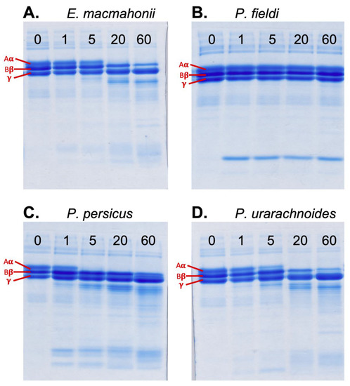 Analysis of fibrinogenolytic activity using SDS-PAGE indicated that P. persicus venom possesses the most rapid fibrinogenolytic activity on the fibrinogen Aα-chain, completely degrading this chain within 5 min (Figure 6C). The migration pattern of the fibrinogen degradation products suggested a greater similarity in fibrinogen cleavage sites between P. urarachnoides (Figure 6D) and E. macmahonii (Figure 6A) venom than between sister species P. urarachnoides and P. persicus. Pseudocerastes fieldi lacked discernible activity in these gels (Figure 6B). The venoms of P. persicus, P. urarachnoides and E. macmahonii all preferentially cleaved the Aα-chain of fibrinogen, followed by the Bβ-chain. This temporal pattern of preferential cleavage follows the dominant cleavage trend amongst vipers. Such fibrinogenases are also known to commonly possess haemorrhagic activity [24]. The fibrinogenolysis observed may thus represent “promiscuous” activity of haemorrhagins, which have been previously described from the venom of P. persicus and E. macmahonii [19]. Bioactivity testing of venom fractions would be illuminating in this regard.