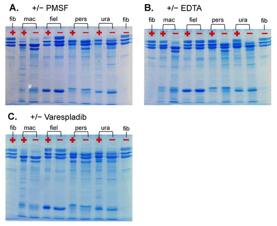 Activity of Eristicophis and Pseudocerastes venoms on human fibrinogen (0.5 μg/mL venom in 1 mg/mL fibrinogen) after 20 min of incubation at 37 °C, with (+) and without (–) inhibitors for (A) serine proteases (1 mM PMSF); (B) metalloproteases (10 mM EDTA) and (C) phospholipases (10 mM Varespladib). fib = fibrinogen control (no venom), mac = E. macmahonii, fiel = P. fieldi, pers = P. persicus, ura = P. urarachnoides.