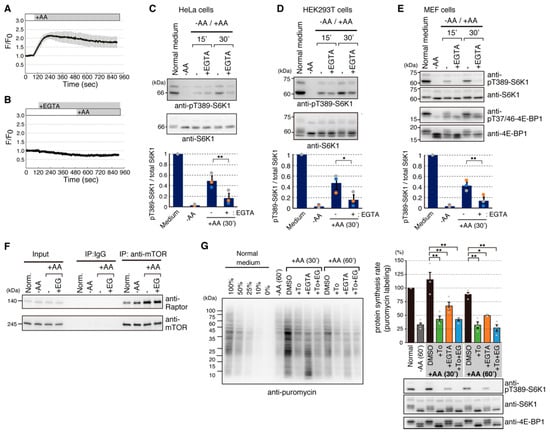 Amino acid-induced Ca2+ entry is involved in mTORC1 activation. (A,B) HeLa cells stably expressing R-GECO1 were deprived of amino acids for 50 min and then an amino acids mixture was added at 120 s. EGTA (final concentration of 3 mM) was added 6 min before the addition of amino acids in (B). Ratios of fluorescence signals (F) for R-GECO1 to the average signals before the addition of amino acids (F0) are shown. Graphs are shown as means ± SEM (n = 20). (C–E) HeLa (C), HEK293T (D), and MEF (E) cells were cultured in a normal medium or transferred to HBSS for 50 min in (C) or 60 min (D,E) (−AA), and then an amino acid mixture was added for the indicated times. EGTA [final concentration of 3 mM (C) or 4 mM (D,E)] was added 5 min before the addition of amino acids. Cell lysates were analyzed by Western blotting with the indicated antibodies. Graphs represent mean ± SEM of three independent experiments, in which the relative intensity of phospho-T389-S6K1 to total S6K1 in normal medium was set to 1. One-way ANOVA with Tukey’s test, ** p < 0.01, * p < 0.05. (F) HEK293T cells were treated as in (D), and cell lysates were subjected to immunoprecipitation (IP) with an anti-mTOR (N-19) antibody. Immuno-complexes were analyzed by Western blotting with anti-mTOR (7C10) and anti-Raptor (10E10) antibodies. (G) MEF cells were cultured in a normal medium and transferred to HBSS for 60 min (−AA), and then HBSS was changed to DMEM without FBS [DMEM(−)] for 30 or 60 min (+AA). Pretreatments with Torin1 (+To), EGTA (+EGTA), and both Torin1 and EGTA (+To+EG) were done 5 min before stimulation with DMEM(−). These compounds were also added to DMEM(−) used for stimulation during experiments. Puromycin (10 μg/mL) was added at the end of each condition and incubated for 15 min. (Left) Cell lysates were analyzed by Western blotting with an anti-puromycin (12D10) antibody. Cell lysates derived from the normal medium condition corresponding to 0%, 10%, 25%, 50%, and 100% were run for making standard curves. Representative results are shown. (Right) Protein synthesis rates were quantified by measuring signals derived from the anti-puromycin antibody as described in Section 4. Data are presented as relative protein synthesis rate with the puromycin-labeled signal from a normal culture medium set to 100. Data are shown as means ± SEM of three independent experiments. One-way ANOVA with Tukey’s test, * p < 0.05, ** p < 0.01. Representative results of Western blotting with indicated antibodies in the puromycin-labeling experiments are shown below.
