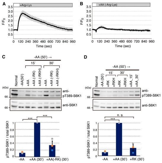 To examine which amino acid(s) is responsible for induction of intracellular Ca2+ rise, we tested the effect of a set of amino acids on Ca2+ rise. Of 13 amino acids tested (Arg, Cystine, Gln, His, Ile, Leu, Lys, Met, Phe, Thr, Trp, Tyr, and Val included in the normal culture medium), Arg and Lys potently induced intracellular Ca2+ rise (Figure 2A and data not shown). A previous study has suggested that Leu alone potently induced intracellular Ca2+ rise []. However, a mixture of amino acids lacking both Arg and Lys but still containing Leu only weakly induced intracellular Ca2+ rise (Figure 2B). Thus, our results suggest that Arg and Lys mainly contribute to the amino acid-induced Ca2+ rise in HeLa cells. To further test the effects of Arg and Lys on the mTORC1 pathway, we added a mixture of amino acid lacking both Arg and Lys to amino acid-starved cells. Compared with the mixture of 13 amino acids, the lack of both Arg and Lys resulted in reduced phosphorylation of S6K1 (Figure 2C), being consistent with the effect of EGTA pretreatment. In contrast, stimulation with only Arg and Lys barely caused phosphorylation of S6K1 (Figure 2D). We also examined the effects of basic amino acids including His. Although the effect of a mixture of amino acids without Arg, Lys, and His was similar to that of amino acids without Arg and Lys (Figure 2C), the addition of Arg, Lys and His slightly increased S6K1 phosphorylation. However, the effect was much weaker than that of the mixture of 13 amino acids (Figure 2D). These results suggested that basic amino acids, especially Arg and Lys, can induce Ca2+ entry to cause an intracellular Ca2+ rise, but these amino acids alone are insufficient for proper mTORC1 activation. This is consistent with the idea that Leu is a primary amino acid that induces the essential activation step, i.e., lysosomal translocation of mTORC1.