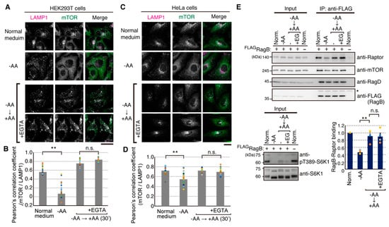 To examine whether amino acid-induced Ca2+ entry affects lysosomal translocation of mTORC1, we next observed subcellular localization of mTOR by immunofluorescence microscopy. As reported previously [], mTOR signals showed diffused patterns under the amino acid-starved condition in both HeLa and HEK293T cells (Figure 3A–D). Upon addition of amino acids, mTOR signals were colocalized with LAMP1-positive organelles, indicating lysosomal translocation of mTOR (Figure 3A–D). EGTA pretreatment did not prevent the lysosomal translocation in response to amino acids addition in both HeLa and HEK293T cells (Figure 3A–D). As mTORC1 is known to be recruited to the lysosomal surface primarily by binding of the Raptor subunit to heterodimeric Rag GTPases in an amino acid-sensitive manner, we further examined the effect of EGTA pretreatment on amino acid-sensitive binding of RagB and Raptor. As previously demonstrated [], we established HEK293T cells stably expressing FLAG-RagB, and used in vivo crosslinking analysis for monitoring the binding of FLAG-RagB with Raptor, mTOR, and RagD in response to amino acids. As shown in Figure 3E, amino acid starvation reduced the binding of Raptor and to a lesser extent mTOR to FLAG-RagB. Readdition of amino acids resulted in recovery of the interaction between FLAG-RagB and Raptor to a level similar to that under the normal growth condition. Consistent with the results of immunofluorescence analysis of the lysosomal translocation of mTOR (Figure 3A–D), pretreatment with EGTA did not prevent amino acid-induced interaction of FLAG-RagB with Raptor or mTOR. The amount of RagD binding to FLAG-RagB was not significantly changed during these treatments. The results suggest that the amino acid-induced Ca2+ rise does not affect the amino acid-mediated recruitment of mTORC1 onto the lysosomal surface.