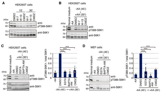 CaM inhibitors generally inhibit mTORC1 activation. (A) HEK293T cells were treated with different CaM inhibitors (W-7 (30 μM), W-13 (50 μM) and calmidazolium (CMDZ, 30 μM)) for the indicated times. Cell lysates were analyzed by Western blotting with the indicated antibodies. (B) HEK293T cells were transferred to HBSS for 45 min (−AA) and pretreated with the indicated CaM inhibitors for the last 15 min and then stimulated with an amino acid mixture (+AA) for 30 min. Cell lysates were analyzed by Western blotting with the indicated antibodies. (C,D) HEK293T cells (C) or MEF (D) cells were transferred to HBSS for 45 min (−AA) and pretreated with the indicated compounds (4 mM EGTA, 50 μM (C) or 10 μM (D) BAPTA-AM, and 30 μM CMDZ) for the last 5 min and then stimulated with an amino acid mixture (+AA) for 30 min. DMSO was used as a control vehicle for CMDZ and BAPTA-AM. Cell lysates were analyzed by Western blotting with the indicated antibodies. Graphs represent mean ± SEM of three independent experiments, in which relative intensity of phospho-T389-S6K1 to total S6K1 in the amino acid stimulation (DMSO) was set to 1. One-way ANOVA with Tukey’s test, *** p < 0.001.
