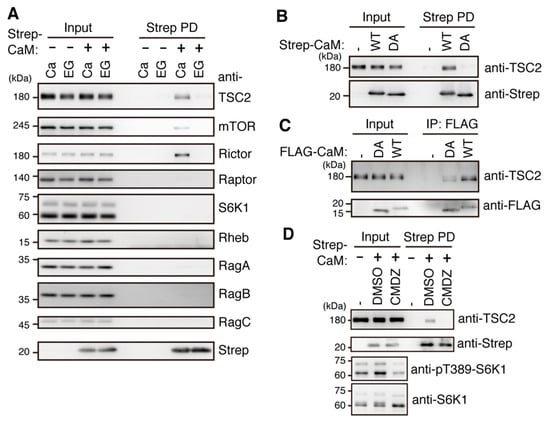 To identify potential factors connecting CaM with mTORC1 signaling, we transiently overexpressed Strep-tagged CaM (Strep-CaM) and screened proteins in the presence or absence of Ca2+. Among the factors in mTOR signaling tested (mTOR, Raptor, Rictor, TSC2, Rheb, RagA, RagB, RagC, and S6K1), we found that TSC2 was bound to Strep-CaM in a Ca2+-dependent manner (Figure 5A), consistent with the previous result using CaM sepharose []. Although mTOR and Raptor were previously reported to bind to CaM sepharose beads as well [], our results indicated that the interaction of CaM with mTOR was weaker than that with TSC2 and that CaM binding to Raptor was below the detectable level. Surprisingly, we found that Rictor, an mTORC2 component, could bind to CaM more strongly in a Ca2+-dependent manner. These results suggest that the weak association of mTOR with CaM might reflect indirect binding through Rictor subunit. Thus, TSC2 might be a strong candidate linking Ca2+ signaling to mTORC1 regulation. To further define the binding mode between CaM and TSC2, we used a Ca2+ binding defective mutant of CaM [] (Strep-CaMDA, in which four Ca2+ coordinate Asp residues were changed to Ala) and found that Strep-CaMDA reduced binding to TSC2 (Figure 5B) and that FLAG-tagged CaM and CaMDA behaved similar to Strep-CaM (Figure 5C). We further tested whether CaM-TSC2 interaction was sensitive to a CaM inhibitor. Indeed, CMDZ treatment, which decreased phosphorylation of Thr389 of S6K1, also reduced binding of CaM to TSC2 (Figure 5D).