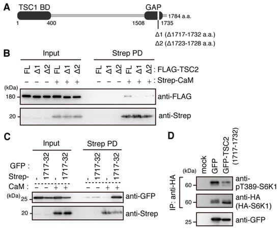 In a previous study, a CaM-binding site was predicted in the C-terminal region of TSC2 []. To examine whether the predicted CaM-binding site within TSC2 contributes to the interaction with CaM, a TSC2 mutant lacking the region (TSC2Δ1717–1732) was tested (Figure 6A, Δ1). Note that the amino acid numbering of TSC2 is based on isoform 4 of human TSC2 in Uniprot throughout this study. Compared with full-length TSC2 (FL), interaction between FLAG-TSC2Δ1717–1732 and Strep-CaM was dramatically decreased (Figure 6B, Δ1). Furthermore, the region of TSC2 corresponding to 1717–1732 a.a. was sufficient for binding of Strep-CaM (Figure 6C). Within the identified CaM-binding region, a naturally occurring TSC2 mutant lacking 6 a.a. (HIKRLR) in TSC patients showing epilepsy has been identified [] (Figure 6A, Δ2). We also tested binding of CaM to TSC2 lacking the 6 a.a. (TSC2Δ1723–1728) and found that the TSC2 mutation also reduced binding to CaM (Figure 6B, Δ2), suggesting that loss of CaM binding to the TSC2 mutation might be associated with onset of TSC diseases. Consistent with both reduction of phosphorylated S6K1 and reduced interaction between CaM and TSC2 by a CaM inhibitor (Figure 5D), overexpression of the minimal binding region of TSC2 with CaM (TSC2 1717–1732 a.a.) resulted in decrease in the phosphorylated form of S6K1 (Figure 6D). Thus, it is likely that binding of Ca2+/CaM with TSC2 underlies the mechanistic basis for Ca2+ signaling to modulate mTORC1 activity.