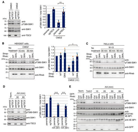Inhibitory effect of CaM inhibitors on mTORC1 is exerted through inactivation of the TSC2-Rheb axis. (A) HEK293T (parental) and HEK293T TSC2 KO (sgTSC2) cells were treated with DMSO or CMDZ (30 μM) for 30 min. Cell lysates were analyzed by Western blotting with the indicated antibodies. Graphs represent mean ± SEM of three independent experiments, in which relative intensity of phospho-T389-S6K1 to total S6K1 in the parental cells (DMSO) was set to 1. One-way ANOVA with Tukey’s test, ** p < 0.01. (B) HEK293T cells stably expressing Strep-Rheb (WT) or high GTP-loaded mutant Strep-RhebQ64L (Q64L) were treated with CMDZ (30 μM) for the indicated times, and cell lysates were analyzed as in (A). Graphs represent mean ± SEM of three independent experiments, in which relative intensity of phospho-T389-S6K1 to total S6K1 in the control cells was set to 1. One-way ANOVA with Tukey’s test, * p < 0.05. (C) HeLa cells stably expressing Strep-Rheb (WT) or high GTP-loaded mutant Strep-RhebQ64L (Q64L) were treated with W-13 (50 μM) for the indicated times, and cell lysates were analyzed as in (A). (D) HEK293T (parental) and HEK293T TSC2 KO (sgTSC2) cells were cultured in the normal condition (Norm.) or starved with amino acids (−AA) for the indicated times, and cell lysates were analyzed as in (A). Graphs represent mean ± SEM of three independent experiments, in which relative intensity of phospho-T389-S6K1 to total S6K1 in the normal medium in parental cells was set to 1. One-way ANOVA with Tukey’s test, *** p < 0.001. (E) HEK293T cells stably expressing GFP (Ctrl), GFP-Rheb (WT) or high GTP-loaded mutant GFP-RhebQ64L (Q64L) were treated as in (D). Torin1 (250 nM) was added to the normal medium for 20 min. Cell lysates were analyzed as in (A).