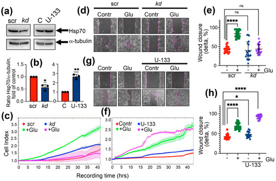 DLD1 cell motility in hyperglycemic conditions depends on Hsp70 level. (a) Western blot of DLD1 (scr, kdHsp70, and control DLD cells induced with 3 μM U-133 with antibody against Hsp70). Antibodies to α-tubulin were used to specify loading control Representative data of three independent experiments are presented. (b) Ratio of the intensity of the Hsp70 bands to the intensity of the α-tubulin bands. * p = 0.0148, ** p = 0.0031. (c) DLD1cells, scr and kdHsp70 (kd) were incubated with 80 mM glucose over 6 days, seeded to 16-well CIM plates and then monitored with the aid of xCELLigence equipment over 44 h. As a control, the migration characteristics of DLD1scr and DLD1kd without incubation with glucose were used. (d) DLD1scr and DLD1kd cells with or without incubation in the presence of high glucose were cultured in 6-well plates. A straight scratch was made in individual wells with a 1000 μL pipette tip, and the wound was photographed 24 h later. (e) The wound closure was calculated as the ratio of the distance of the overgrown area of the scratch at 24 h to the distance at 0 h after damage in 21 lines (delta). The distance was measured using the Adobe Photoshop CS6 program. Data are presented in % of delta. **** p < 0.0001. (f) DLD1 cells were incubated with 80 mM of glucose and 3 μM of U-133 over 6 days and then were monitored with the aid of xCELLigence equipment over 44 h. (g) Wound assay of DLD1 cells induced with 80 mM of glucose and 3 μM of U-133. (h) The wound closure was calculated as on (e). * p = 0.0124, **** p < 0.0001.