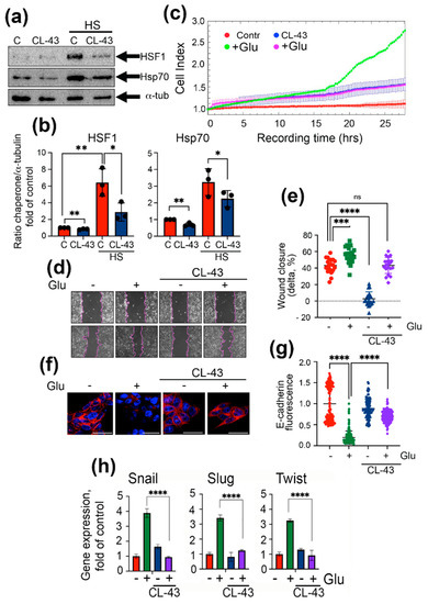Inhibitor of master regulator HSF1 (CL-43) decreases cell motility and EMT markers expression in DLD1 cells. (a) Western blotting of DLD1 cells, controls and cells treated with 500 nM CL-43 before heat shock (43 °C, 30 min, and 18 h of recovery) probed with antibody against HSF1, Hsp70 and α-tubulin (as a loading control). (b) Ratio of intensity of HSF1 or Hsp70 bands to band intensity of a-tubulin. Band intensity was measured with the aid of ImageJ. Data of three western blots were calculated. * p = 0.0212, 0.0442, ** p = 0.0020, 0.0080, 0.0015. (c) After 6 days of incubation with 80 mM glucose and 0.5 μM CL-43, DLD1 cells were seeded to 16-well CIM plates and then monitored with the aid of xCELLigence equipment over 28 h. (d) Wound healing assay of DLD1 cells treated as in (b) with calculation (e) as the ratio of the distance of the overgrown area of the scratch at 24 h to the distance at 0 h after damage in 21 lines (delta). The distance was measured using the Adobe Photoshop CS6 program. Data are presented in % of delta. *** p = 0.0001, **** p < 0.0001 (f) E-cadherin expression in DLD1 cells treated with 80 mM glucose and 500 nM CL-43 revealed with the aid of confocal microscopy. (g) The fluorescence of each single cell was measured with the aid of Image J. Data are presented as a fold of control. **** p < 0.0001. (h) Snail, Slug, and Twist gene expression in DLD1 cells treated over 7 days with 80 mM glucose and 500 nM CL-43 analyzed with the aid of qPCR.