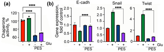 Inhibitor of Hsp70 function, PES, suppresses expression of EMT markers in patient’s HCC-9 cells. (a) HCC-9 cells were incubated with 3 μM PES and 80 mM glucose over 6 days and the chaperone activity of Hsp70 expressed in these cells was measured with aid of Chap-ELISA. **** p < 0.0001. (b) Levels of E-cadherin, Snail, and Twist in HCC-9 cells treated with PES and high glucose were measured with aid of qPCR.