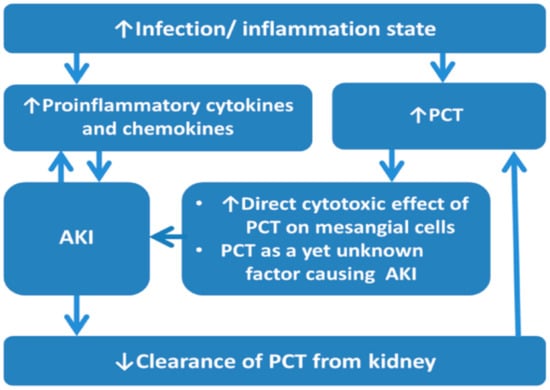 To date, serum PCT level is found higher in AKI patients compared with those without AKI in varied clinical settings. The potential explanations for the association between elevated PCT levels and AKI in infection/inflammation situations include: (1) AKI is associated with elevated proinflammation cytokines and chemokines, such as interleukin-1, interleukin-6, and tumor necrosis factor-α, involved in the infection and inflammation state [37]. (2) Infection and inflammation state increase serum PCT concentration, and kidneys might also contribute to PCT production under this situation [7]. (3) PCT has a direct cytotoxic effect on mesangial cells, causes mesangial cell apoptosis, and plays a yet unknown role in the pathogenesis of AKI [32,38]. (4) The diminished clearance of PCT from the kidney, even in the early stage of AKI before a significant serum creatinine elevation [17], causes elevated PCT concentration and subsequent kidney damage. (Figure 1)