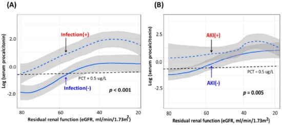 Renal function impairment may associate with elevated serum PCT levels [24,39], partially because of the decreased PCT elimination from the kidney [40]. However, the elevated plasma PCT level in the AKI population might not be merely a sequence of impaired renal function as in CKD patients. Our previous work addressed the essential relationship of serum PCT levels with residual renal function, the presence of infection, and AKI [25]. In that study, serum PCT level showed an increasing trend along with the worsening residual renal function (indicated by the decreasing estimated glomerular filtration rate (eGFR)) irrespective of the existence of infection (Figure 2A) and AKI (Figure 2B). Moreover, significantly higher serum PCT concentrations were revealed in infected patients compared with non-infected patients and in AKI patients than in those without AKI at the same corresponding eGFR levels. The above findings indicated that AKI was associated with serum PCT level elevation and that the association was more potent than residual renal function [25] (Figure 2).