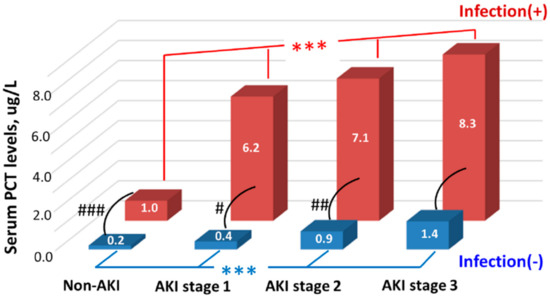 Serum PCT levels among groups stratified by AKI stages and infection states. Note: We used the median values to express the levels. *** indicated p < 0.001 among groups with different AKI stages. #, ##, ### indicated p < 0.05, <0.01, <0.001, respectively, between infected and non-infected groups. The figure was modified from the work of Huang et al. [25]. Abbreviations: AKI, acute kidney injury; PCT, procalcitonin.