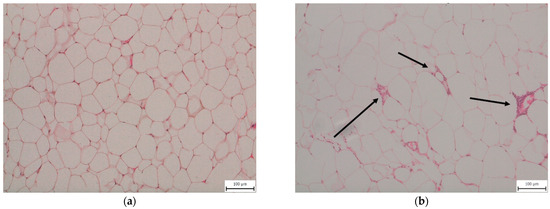Representative histopathological samples of epididymal adipose tissue taken from mice fed (a) a control diet (CD30) or (b) a Western-style diet (WD30) for 30 weeks—hematoxylin and eosin staining. Arrows indicate macrophage crown-like structures in the WD30 group.