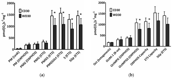 The convergence of different available substrates simultaneously feeding electrons to the ETS must be considered for a better understanding of mitochondrial metabolism. For evaluation of mitochondrial respiration, a mixture of respiratory substrates and substrate-uncoupler-inhibitor titration (SUIT) respiratory protocols (RP) were used [14,24]. We observed decreased oxygen consumption after the addition of succinate (S) in both the oxidative phosphorylation (OXPHOS) and electron transfer system states (ETS) (p < 0.05) (Figure 3a,b). When utilizing NADH-dependent substrates (pyruvate P, malate M, glutamate G) in the OXPHOS state, the efficacy of the uncoupler in controlling respiratory flow was slightly but not significantly (p = 0.065) reduced. Substrate flux control efficiency is expressed as the percent increase in respiration after substrate addition. Using the RP1, calculated efficiency of the uncoupler was 32.2 ± 6.4% in the CD30 group and 15.5 ± 12.4% in the WD30 group (Figure 3a, PMG (ETS) vs. PMG (OXPHOS)). This may indicate a slight decrease in respiratory reserve capacity for NADH-dependent substrates in the WD30 group. The flux control efficiency for succinate in the OXPHOS state was significantly lower (p < 0.01) in the WD30 group (48.9 ± 7%) than in the control group (64.3 ± 2%). Total respiratory reserve capacity was unaffected by WD feeding, although OXPHOS capacity was significantly reduced (p < 0.05). We also observed an insignificant reduction in ETS capacity (Figure 3b).