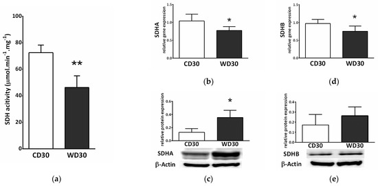 Feeding mice a WD resulted in a reduction in the specific activity of SDH (p < 0.01) (Figure 4a). We also observed decreased gene expression of subunits A and B of SDH (p < 0.05) in the WD30 group (Figure 4b,c), although the protein expression of SDHA was significantly increased (p < 0.05) (Figure 4c).