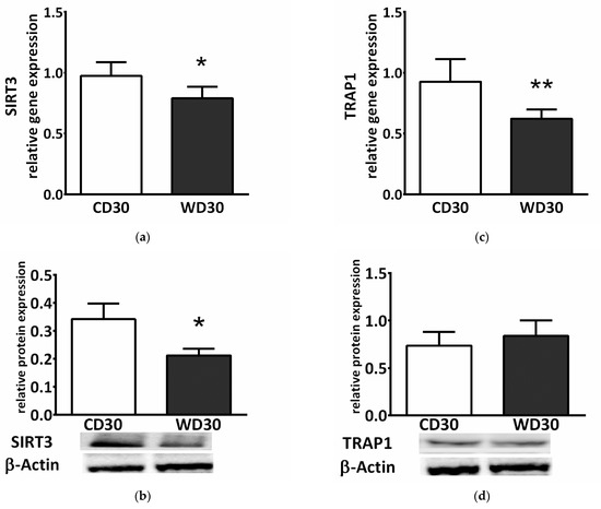 SDH activity is highly regulated by posttranslational modifications. We observed decreased gene and protein expression of mitochondrial NAD+-dependent deacetylase sirtuin 3 (SIRT3) in the WD30 group (p < 0.05) (Figure 5a,b). SDH activity can also be regulated by the mitochondrial chaperone tumor necrosis factor receptor associated protein 1 (TRAP1). WD feeding did not lead to increased TRAP1 protein expression (Figure 5d), and TRAP1 gene expression actually decreased in the WD30 group (p < 0.01) (Figure 5c).