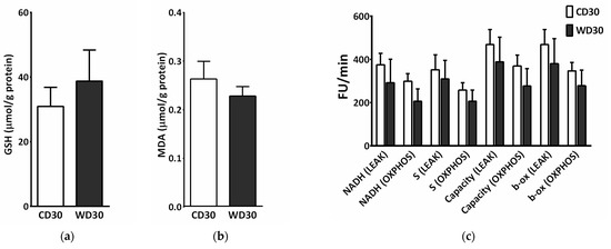 We did not observe a significant difference between the groups in levels of hepatic reduced glutathione (GSH) or malondialdehyde (MDA) (Figure 6a,b). To measure ROS production, liver homogenates were incubated with a mixture of NADH-linked substrates, succinate, a mixture of NADH- and FADH2-linked substrates, and octanoylcarnitine, or octanoylcarnitine plus malate. Measurements were performed in the presence (OXPHOS state) or absence (LEAK state) of adenosine diphosphate (ADP). There was no significant difference in ROS production between groups; however, ROS production appeared to be slightly decreased in the WD30 group (Figure 6c).