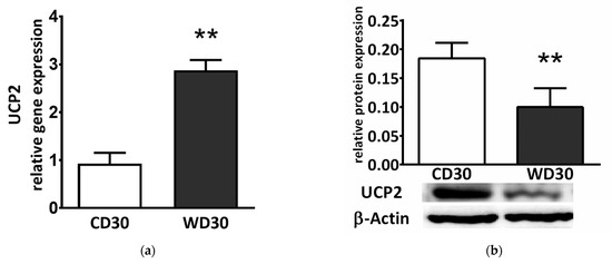 (a) Relative hepatic UCP2 gene and (b) protein expression in mice fed a control diet (CD30) or a Western-style diet (WD30) for 30 weeks. Results are expressed as the means ± SD; ** p < 0.01 (n = 6 each group).