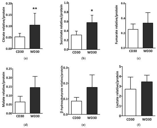 Liver metabolomic analysis in mice fed a control diet (CD30) or a Western-style diet (WD30) for 30 weeks. (a) Relative level of citrate. (b) Relative level of succinate. (c) Relative level of fumarate. (d) Relative level of malate. (e) Relative level of β-hydroxybutyrate. (f) Relative level of lactate. Results are expressed as the means ± SD; * p < 0.05, ** p < 0.01 (n = 6 each group).