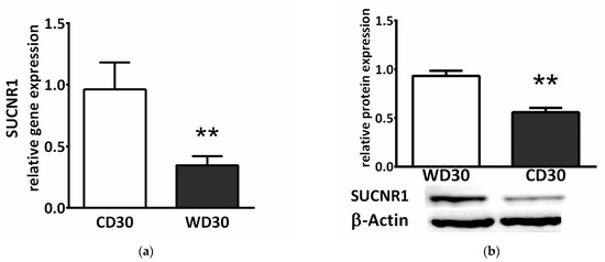 SUCNR1 expression in mice fed a control diet (CD30) or a Western-style diet (WD30) for 30 weeks. (a) Relative gene and (b) protein expression. Results are expressed as the means ± SD; ** p < 0.01 (n = 6 each group).