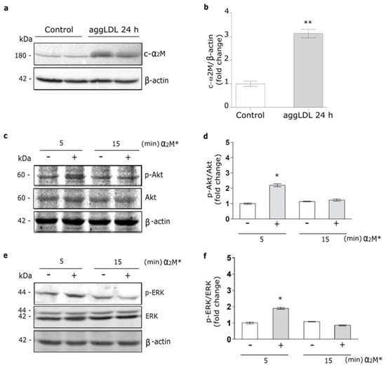 α2M* activates PI3K/Akt and MAPK/ERK pathways in HL-1 cardiomyocytes. (a) Western blot assay for the analysis of 180 kDa-subunit from mouse tetrameric α2M (c-α2M) expression in protein extract of HL-1 cardiomyocytes treated with aggLDL 100 µg/mL for 24 h. Bands are shown in duplicates. β-actin was used as loading control. The electrophoresis conditions are detailed in the Materials and Methods section. (b) Densitometric quantification of Western blot data for c-α2M/β-actin expressed as fold change respect to non-stimulated control (white bar). Values are expressed as mean ± SEM. ** p < 0.01 vs. non-stimulated control. (c,e) Western blot assay for the analysis of phosphorylated Akt (p-Akt) (c) or phosphorylated ERK (p-ERK) (e) in cells treated with α2M* 60 nM for 5 and 15 min. Total Akt (Akt), total ERK (ERK) and β-actin were used as loading control (d,f). Densitometric quantification of Western blot data for p-Akt/Akt (d) or p-ERK/ERK (f) expressed as fold change respect to non-stimulated control (white bar). Values are expressed as mean ± SEM. * p < 0.05 vs. non-stimulated control. Three experiments were performed (n = 3).