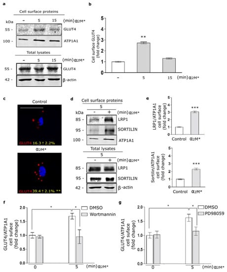 In a previous work, we found that α2M* promotes LRP1 traffic to PM in the Müller glial-derived cell line, MIO-M1 cells []. Moreover, in this cell type we demonstrated that insulin increases the LRP1 expression on cell surface by a regulated exocytic pathway, involving the sorting of GLUT4-storage vesicles (GSVs) to the PM []. In myocardium, the insulin-induced intracellular signaling activation leads to GLUT4 translocation to the PM []. Considering these data, we analyze the α2M* effects on the GLUT4 traffic to the cell surface in HL-1 cardiomyocytes by biotin-labeling protein assays. Figure 2a,b show increased levels of GLUT4 on cell surface by α2M* at 5 min of stimulation with respect to the control condition. By contrast, α2M* stimulus for 15 min did not show effect of GLUT4 expression on PM compared to control. This evidence was corroborated by confocal microscopy in cells treated with α2M* for 5 min and then incubated with anti-GLUT4 in non-permeabilizing conditions (Figure 2c). Similar results were found for LRP1 and sortilin, other constitutive proteins of GSVs [,] (Figure 2d,e). Next, we evaluate whether GLUT4 traffic to the PM was dependent on PI3K/Akt and MAPK/ERK intracellular signaling activation by α2M*. For this, we performed a cell surface protein detection assay in which HL-1 cardiomyocytes were pre-incubated 30 min with wortmannin (PI3K inhibitor) or PD98059 (MAPK inhibitor) and then treated with α2M* for 5 min. Figure 2f,g shows that α2M*-induced GLUT4 increase on PM was significantly reduced through the blocking PI3K/Akt and MAPK/ERK intracellular signaling activation. Thus, our data shows that α2M* can activate PI3K/Akt and MAPK/ERK pathways and increase GLUT4 expression at the cell surface of HL-1 cardiomyocytes.