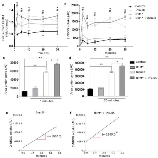 Considering the α2M* effect on the GLUT4 traffic to the PM, we evaluated the glucose uptake in HL-1 cardiomyocytes. Thus, cells were treated with α2M* for 2 to 30 min together with 2-NBDG, a glucose fluorescent analogue. Figure 4a,b shows that α2M* did not produce significant changes in 2-NBDG uptake with respect to the non-stimulated control. Thus, although α2M* was able to induce the GLUT4 traffic to PM, it had no effect on the glucose control. Considering that insulin induces GLUT4 traffic and the glucose uptake into different cell types, our interest was to evaluate if α2M* may have effect on the insulin response in HL-1 cardiomyocytes. For this, cells were treated with α2M* and insulin for 2 to 30 min together with 2-NBDG. Figure 4a shows that the combined treatment of α2M* and insulin at the first 5 min promptly enhanced the GLUT4 expression on the PM compared with the individual effect of α2M* or insulin. After this time, the combined treatment of α2M* and insulin produced a similar level of GLUT4 expression on the cell surface than insulin and major than α2M* alone. In the same way, α2M* + insulin induced a fast 2-NBDG uptake at the first 5 min of stimulus, which was similar with insulin alone after this time (Figure 4b). The area under the curve analysis shows that α2M* + insulin significantly increased the 2-NBDG uptake both at the first 5 min as well as at 30 min of stimulus compared to insulin alone (Figure 4c,d). Using simple linear regression analysis, we found that α2M* + insulin increased the uptake rate respect to insulin stimulus (Figure 4e,f). These results suggest that α2M* enhances the insulin response, increasing GLUT4 traffic to PM and insulin-induced glucose uptake in HL-1 cardiomyocytes.
