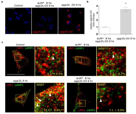 In a previous work we found that LRP1 is the main receptor responsible for the binding and endocytosis of aggLDL in HL-1 cardiomyocytes []. These lipoproteins bind to cluster II of α-subunit of LRP1, and this domain is also involved in the interaction with α2M* [,,,]. Other studies showed that anti-P3 antibodies reduced foam cell formation through the blockade of LRP1 interaction with atherogenic lipoproteins in cluster II [,]. Here, we evaluated whether α2M* blocks aggLDL accumulation. HL-1 cardiomyocytes were incubated with α2M* together with DiI-labeled aggLDL (aggLDL-DiI) for 8 h at 37 °C. Figure 5a,b shows that aggLDL-DiI was accumulated in HL-1 cardiomyocytes, but this accumulation was inhibited by α2M*. In normal conditions, CE is stored at a low proportion in lipid droplets []. However, excessive aggLDL uptake leads to CE accumulation in lysosomes []. In previous studies, we showed that LRP1 did not localize in lysosomes in different cell types [,,]. Lysosomal degradation of α2M* leads to an endocytic recycling of LRP1 to the cell surface []. Here, we analyzed the intracellular localization of LRP1 after aggLDL stimulation by confocal microscopy. Figure 5c shows that aggLDL generated a localization of LRP1 in the degradation compartments, similar to late endosomes/lysosomes [LAMP+], with respect to α2M* stimulus and control condition. This effect of aggLDL on the distribution of LRP1 in degradation compartments was fully blocked by α2M*. These data indicate that α2M* inhibits the internalization of the aggLDL by LRP1 and the receptor transport into degradation compartments.