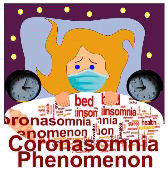 Nowadays, the modified COVID-19 causes atypical infiltrated pneumonia with many neurological symptoms and sleep disorders [,,]. The current COVID-19 pandemic significantly affects our daily activities due to social distancing, which is impacting work, social, educational, and entertainment activities [,,]. Indeed, for the last 1.5 years, the international news is focused mainly on health, employment, finance, and economic recession associated with the COVID-19 pandemic. These uncertainties have exposed many people to stress, such as social confinement, limited daylight exposure, and changes in daily routines, which are also associated with various sleep disturbances, known as the ‘coronasomnia’ phenomenon (Figure 1) [,,]. Notice that it is not a new phenomenon. Several epidemiological studies reported that insufficient sleep, poor sleep quality, insomnia, sleep apnea, and disturbances of sleep–wake schedules are typical manifestations of physical and emotional morbidity in a worldwide pandemic []. Several studies have previously documented the impact on sleep of major events, such as earthquakes, floods, wild fires, and war-time [,].