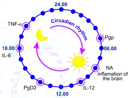 The biological clock of the blood–brain barrier permeability to cytokines (TNF-α, IL-6, IL-1α) and regulating their activity factors, such as hormones (NA and PGD2) and permeability-glycoprotein multidrug transporter (Pgp).