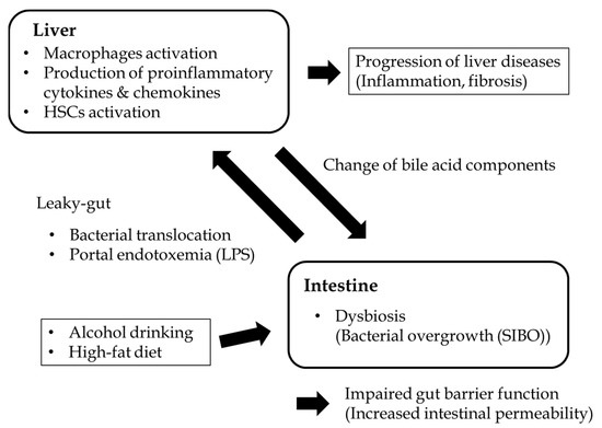 Various studies have revealed that gut-derived endotoxins from the gut microbiota could be closely associated with CLDs. Lifestyle factors, such as dietary factors and alcohol drinking, are fundamental therapeutic targets for preventing the pathogenesis of liver diseases in terms of the gut–liver axis. Dysbiosis and leaky gut are induced by alcohol and a high-calorie/high-fat diet, which results in liver inflammation and liver fibrosis progression, eventually progressing to liver cirrhosis, especially in patients with alcoholic liver disease and NAFLD. As mentioned above, it is already known that endotoxemia is associated with the occurrence of cirrhotic complications in patients with liver cirrhosis via activation of TLR4 signaling in KCs and HSCs. This gut–liver axis resulting from gut dysbiosis might also induce the development of HCC. Considering these findings, the gut microbiota and gut-derived endotoxemia could be useful therapeutic targets in the management of the progression of liver pathogenesis, and further investigation in this field is expected in the future.