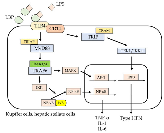 Intracellular signaling of the TLR4 pathway via LPS binding. Liver cells such as Kupffer cells and hepatic stellate cells contain TLR4, which mediates the innate immunity response. LPS binding to LPS binding protein, which is a translocator for LPS, attaches to TLR4 and stimulates its downstream signal, including NF-κB and mitogen-activated protein kinase, which induces the transcription of proinflammatory cytokines and chemokines such as TNF-α, IL-1, and IL-6. These inflammatory cytokines cause liver inflammation as well as activating hepatic stellate cells, leading to excessive production of the extracellular matrix, which suggests that chronic exposure of LPS can result in the progression of liver fibrosis, culminating in liver cirrhosis.