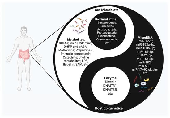 In recent years, with the rapid advance of gut microbiota research, it has been revealed that acquired factors such as diet, antibiotic use, infections, etc., could regulate microbial communities via epigenetic approaches, affecting the homeostasis and disorder status of a host []. Epigenetic modifications can affect a host’s pathological conditions by manufacturing a nutritional profile or shaping the structure of gut microbiota. For example, microRNA (miRNAs), as a minimal mediator, can enter the gut microbiota and shape their composition, ultimately affecting the host’s intestinal health [,,,,,].