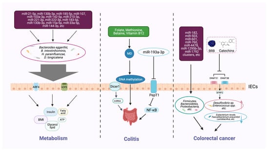 Epigenetic mechanisms can influence the microbial community and microbiota-derived metabolites; specifically, miRNA is deeply involved in microbiota shaping []. Recent studies have shown that host miRNAs are involved in the regulation of gut microbiota. MiRNAs in the intestinal lumen are derived from intestinal epithelial cells (IECs), as well as goblet and paneth cells, and are excreted through exosomes []. MiRNAs from the host can specifically regulate the transcription of microbial genes and then affect the growth of intestinal microflora and microbiota structure []. A multitude of studies have confirmed that miRNAs can control the growth of microbiota and shape the structure of the microbial community [,]. For example, coculture of the miRNAs with microbiota can induce significant gene expression changes in microbiota []. By adding synthesized miRNA to the bacterial culture medium in vitro, we found that miRNA changed the gene expression of bacteria, such as F. nucleatum and E. coli. Furthermore, mice given specific miRNA also demonstrated changes in the E. coli growth and bacterial gene transcripts. The results indicated the levels of miRNA were negatively correlated with the abundance of the gut microbiota [] (Table 1).