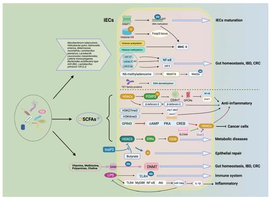 As an indispensable symbiont of the human body, microbiota can induce epigenetic modifications in a host. More specifically, the human body can adapt to environmental stimuli via DNA methylation, histone modifications, or other epigenetic approaches []. Gut microbiota regulate host epigenetics, primarily by producing metabolites to maintain the dynamic balance of the body, such as generating SCFAs to modify the host epigenome, which affects the body’s state of health and its diseases [,,,].