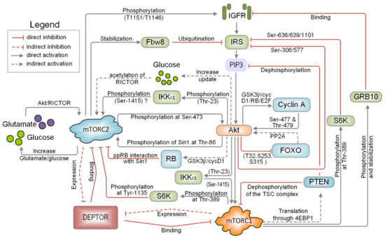 A schematic diagram in the form of flowchart that depicts explicitly multiple feedback and feed-forward loop mechanisms emerging from within the PI3K/mTOR pathway and its crosstalk with other pathways. For each mechanism, the underlying biological details are highlighted. mTORC2 phosphorylates IR and IGF-IR on tyrosine residues 1131/1136 and 1146/1151. mTORC2 stabilises Fbw8 to translocate into the cytosol and ubiquitinate IRS1. Akt enhances glucose uptake, which activates mTORC2 through acetyl-CoA-mediated acetylation of RICTOR. IKKα is phosphorylated at Thr-23 and activated by Akt, which leads to activation of mTORC1 through the phosphorylation at Ser-1415 residue and mTORC2 via an unknown mechanism. mTORC2 phosphorylates Akt at Ser-473 and activated Akt phosphorylates Sin1 at Thr-86 and consequently activates mTORC2. Akt promotes Rb hyper-phosphorylation through inhibition of GSK3β and cyclin D1. Hyper-phosphorylated Rb binds to and inhibits Sin1, leading to inhibition of mTORC2. mTORC1 phosphorylates (at Thr-389) and activates S6K1, which in turn phosphorylates RICTOR at Tyr-1135, inhibiting the mTORC2 activity. S6K also phosphorylates IRS1 at Ser-636/639/1011, causing IRS1 inhibition. DEPTOR blocks mTORC1/2 activation and mTORC1/2 downregulate DEPTOR. mTORC1 phosphorylates and stabilizes Grb10, which is linked to inhibition of IR/IGFR. PTEN dephosphorylates TSC1/2, which blocks mTORC1 activation. mTORC1 increases eIF4E activity, resulting in upregulation of PTEN translation and expression. Akt phosphorylates and inhibits FOXO. Unphosphorylated FOXO inhibits PP2A, which dephosphorylates Akt and blocks its activity. Akt enhances cyclin A expression. The cyclin A2-CDK2 complex phosphorylates Akt at Ser-477 and Thr-479, which stabilises Akt Ser-473 phosphorylation and promotes Akt activity. Glucose uptake is enhanced by Akt, leading to activation of mTORC2 through acetyl-CoA-mediated RICTOR acetylation.
